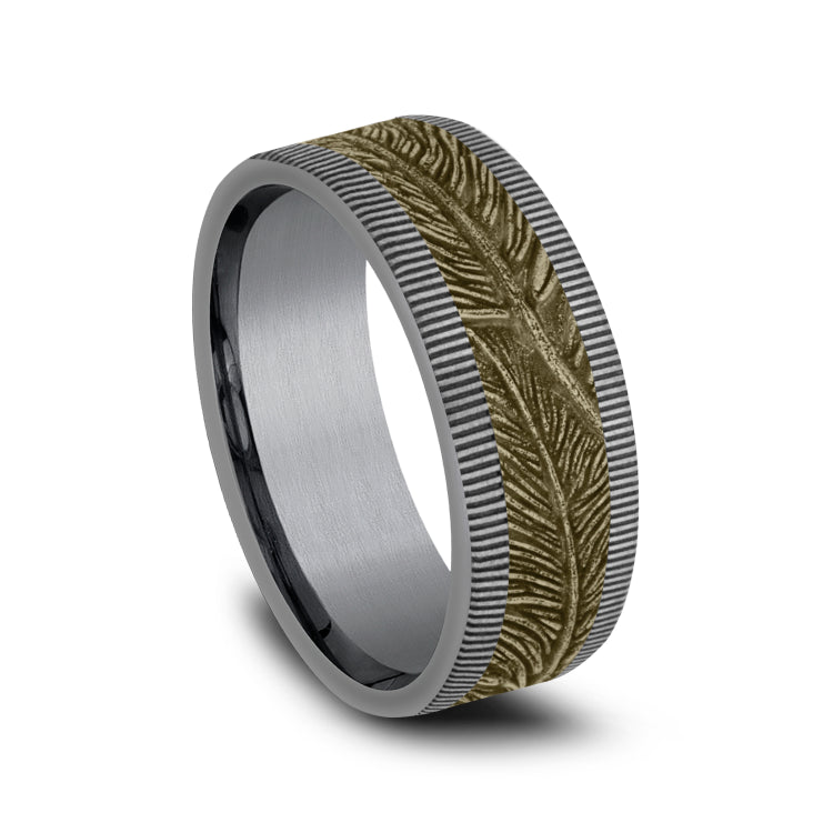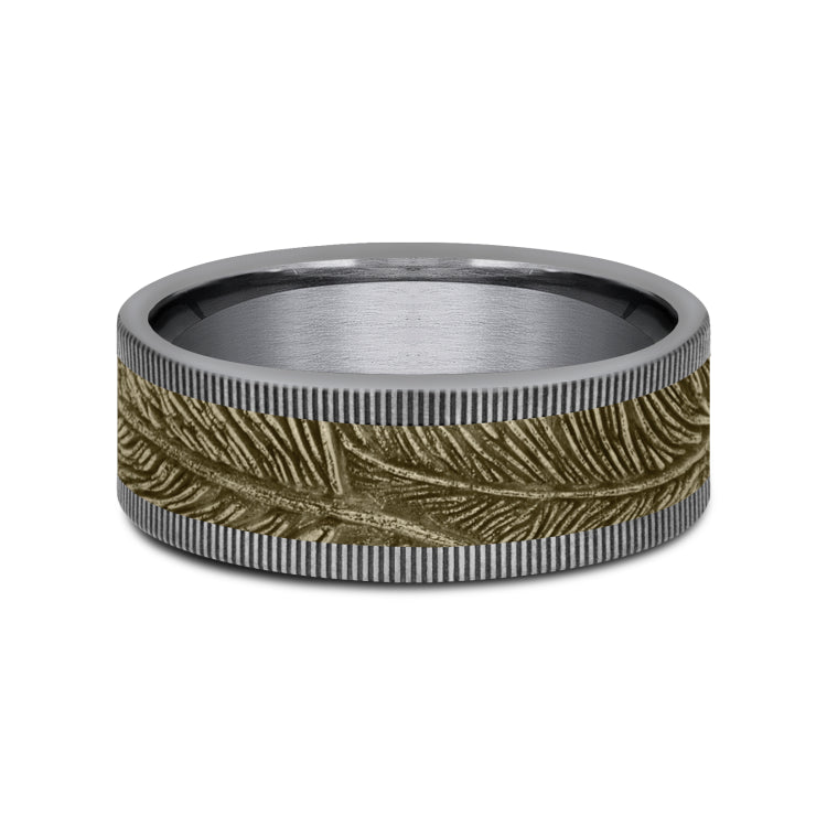 8mm, Comfort fitGrey Tantalum and 14K Yellow GoldFeather patterned center with milgrain detail