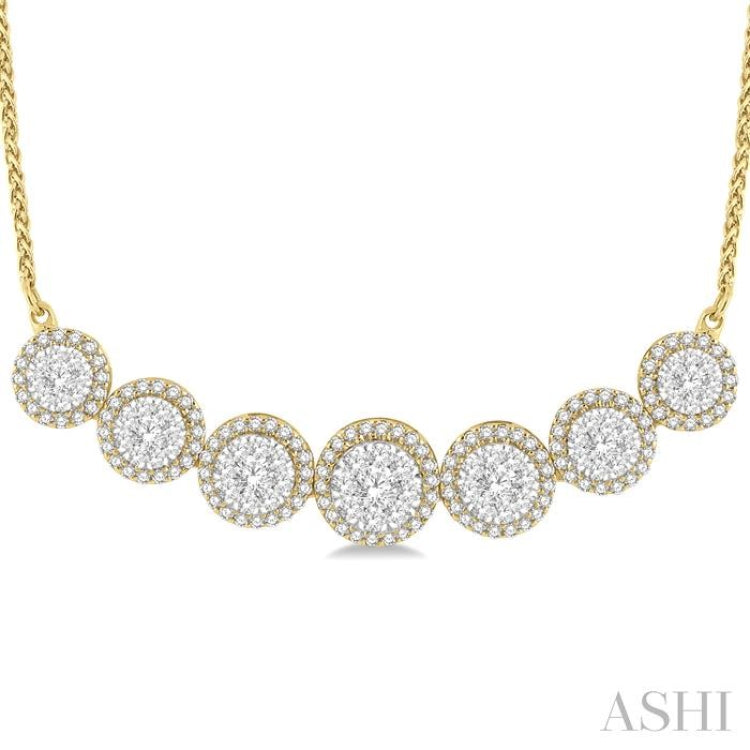 A gorgeous diamond necklace, this draws your attention like every piece of accessory in the Lovebright collection. It features a 7 round mount centerpiece, with a large round mount in the center and three each round mounts flanking it on either side. These mounts also get slightly smaller than their preceding mounts. 63 invisible set round cut diamonds embellish the 14 karat white gold center of these 7 mounts, while 130 micro wall set round cut diamonds form a border around these, on the mounts. A 1.1MM 16-inch wheat chain completes the necklace, which is styled in 14 karat yellow and white gold. Total diamond weight is 1 1/5 Ctw.