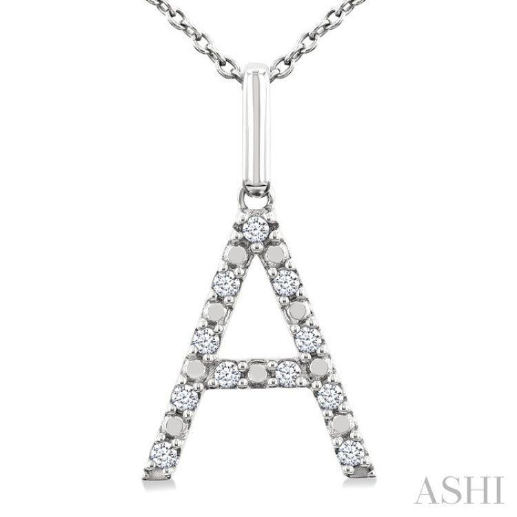 The initial 'A' holds significance for many, representing names, loved ones, or personal mantras. Whether worn as a symbol of self-expression or as a thoughtful gift for someone special, this diamond fashion pendant is a delightful expression of personal style, featuring the initial 'A' embellished with sparkling round cut diamonds. 11 prong set round cut diamonds delicately accentuate the letter, adding a touch of beauty to the pendant. Paired with a sleek Cable Chain 1.00 MM in 18 Inches with Spring Lock & Extenders at 16" & 17", both of which are styled in a rhodium finish sterling silver, this pendant is perfect for everyday wear. The total diamond weight is 1/10 Ctw.