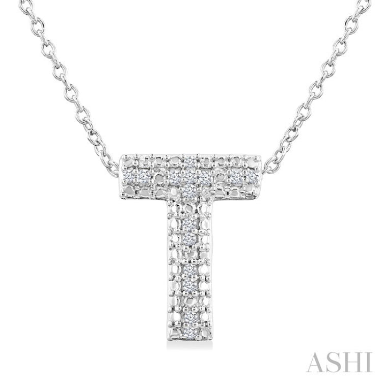 Perfect for gifting or treating yourself, this charming, personalized diamond initial fashion pendant captures the essence of individuality and sophistication. It features a bubble-textured face that adds a touch of whimsy and elegance to the design. The initial 'T' is embellished with 15 prong set round cut diamonds, which sparkle brilliantly against the sleek silver backdrop. Paired with a delicate Cable Chain 1.00 MM in 18 Inches with Spring Lock & Extenders at 16" & 17", both the pendant and chain are styled in a rhodium finish sterling silver. Whether worn alone or layered with other necklaces, this stunning initial fashion pendant is sure to become a cherished piece in your jewelry collection. The total diamond weight is 1/20 Ctw.
