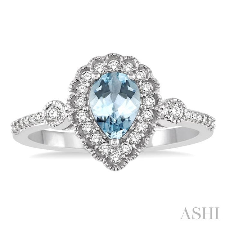 7X5MM Pear shape Aquamarine Center and 1/4 Ctw Round Cut Diamond Precious Stone Ring in 14K White Gold