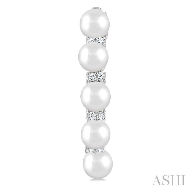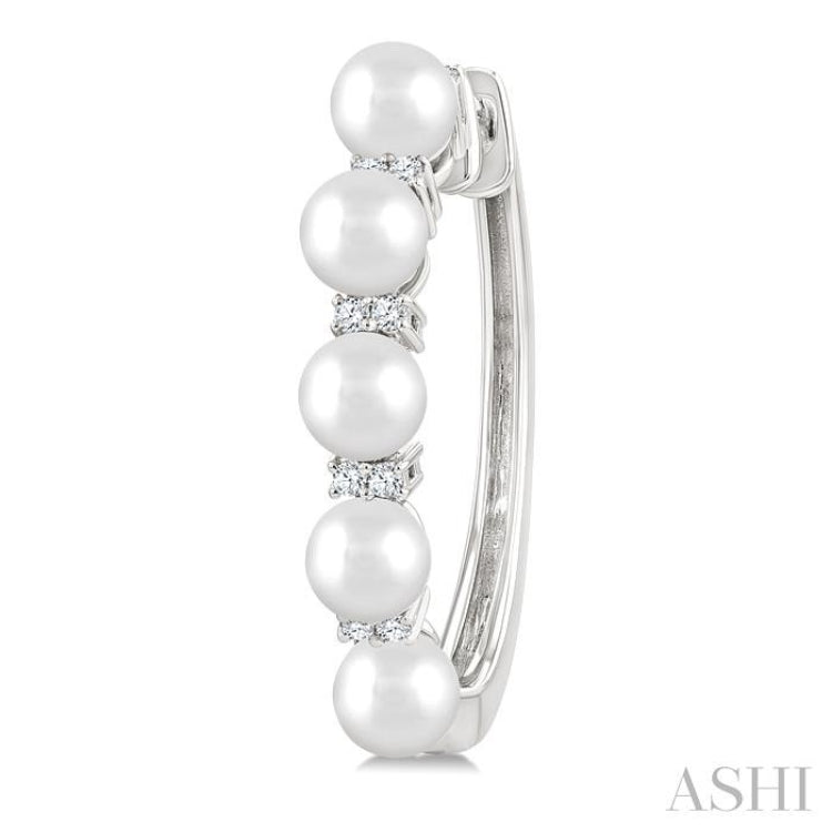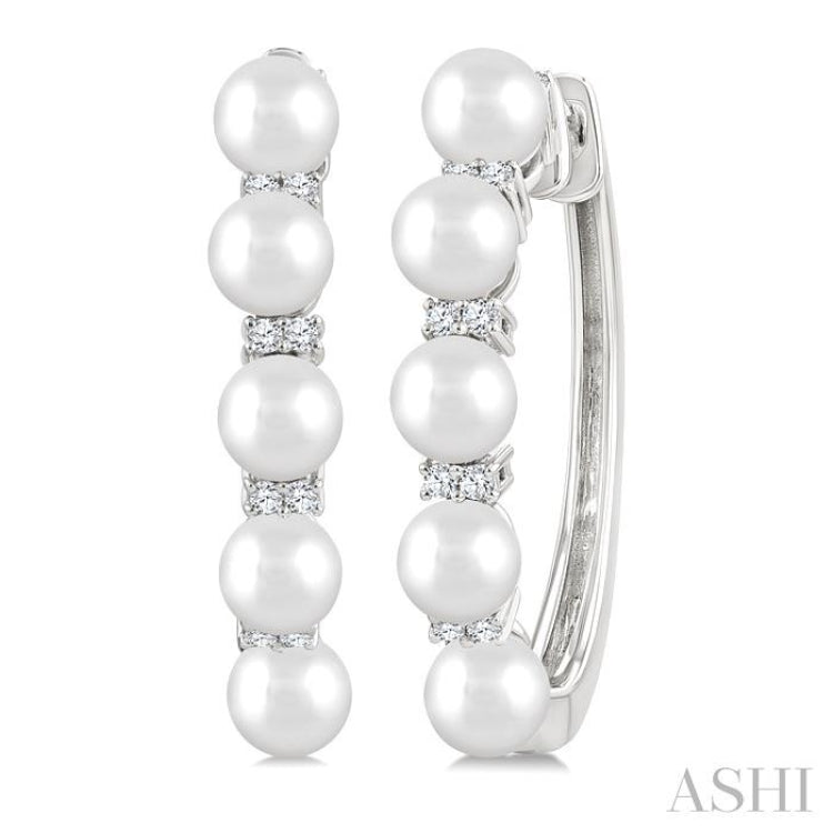 These graceful fashion hoop earrings symbolize balance and timeless elegance, with the luminous purity of pearls paired harmoniously with the brilliance of diamonds. Each hoop showcases an alternating row of five 4MM round white pearls and twelve prong hand set round cut diamonds laid out in sets of two, adorning the hoop front in a refined rhythm of light and luster. A secure latch back closure ensures both comfort and wearability. The fashion hoop earrings are styled in rhodium finish 10 karat white gold. Total diamond weight is 1/6 Ctw.